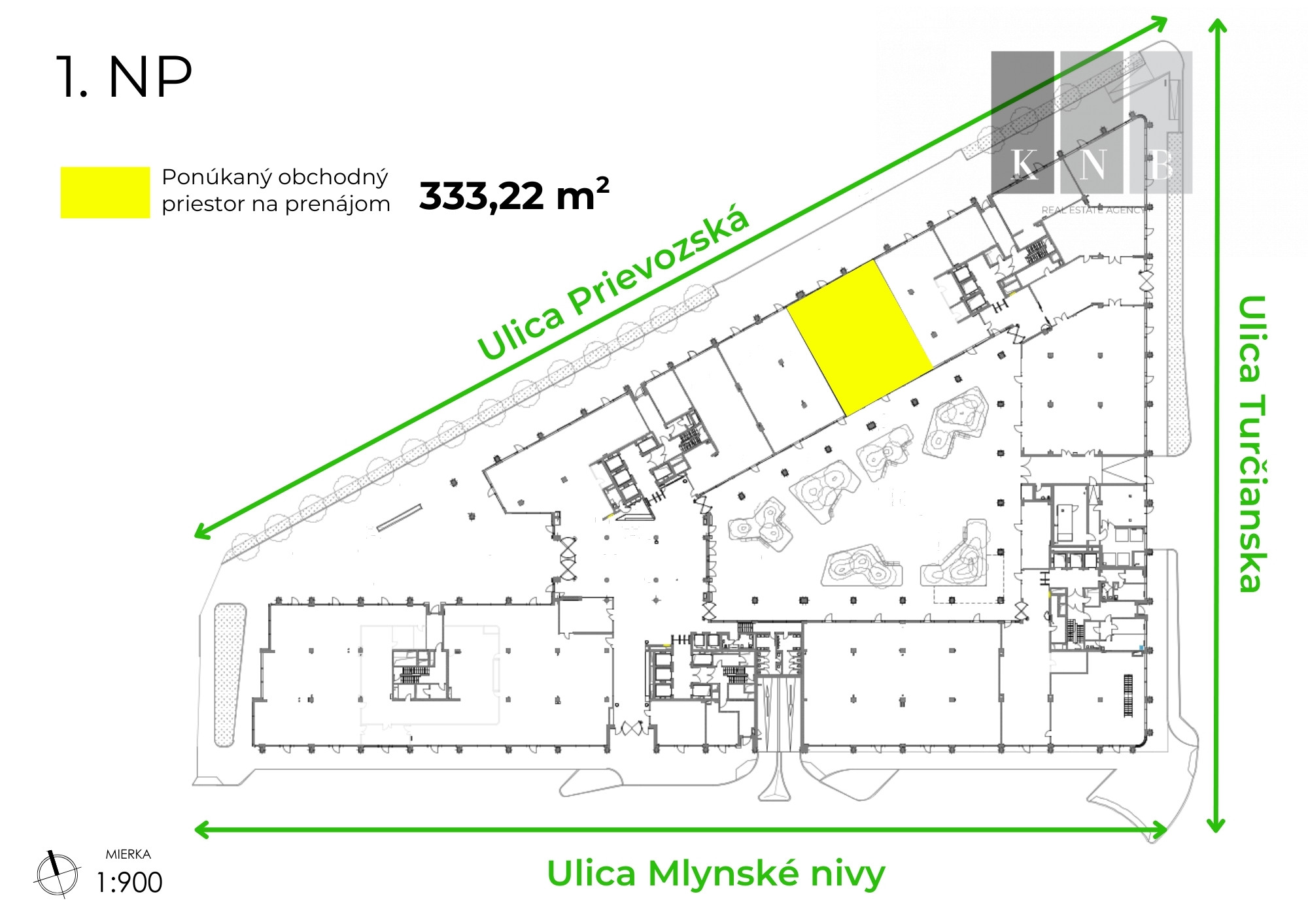 KNB Real Estate Agency offers for rent a retail unit with a total area of 333 m², located on the ground floor of the new Apollo Nivy office building on the busy Prievozská Street in the dynamic Bratislava–Nové Nivy district.