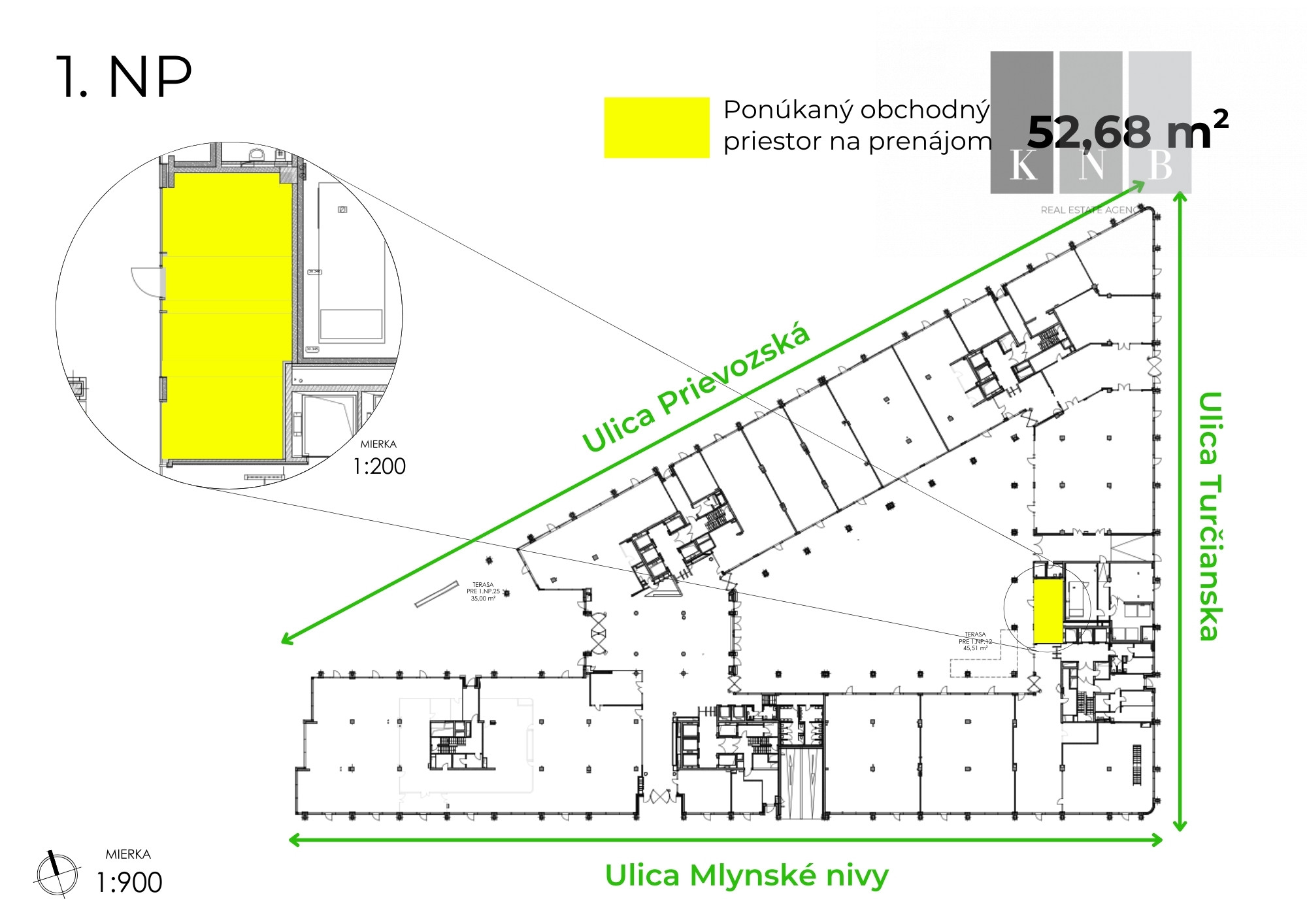 KNB Real Estate Agency offers for rent a retail unit with a total area of 52 m², located on the ground floor of the new Apollo Nivy office building on the busy Prievozská Street in the dynamic Bratislava–Nové Nivy district.